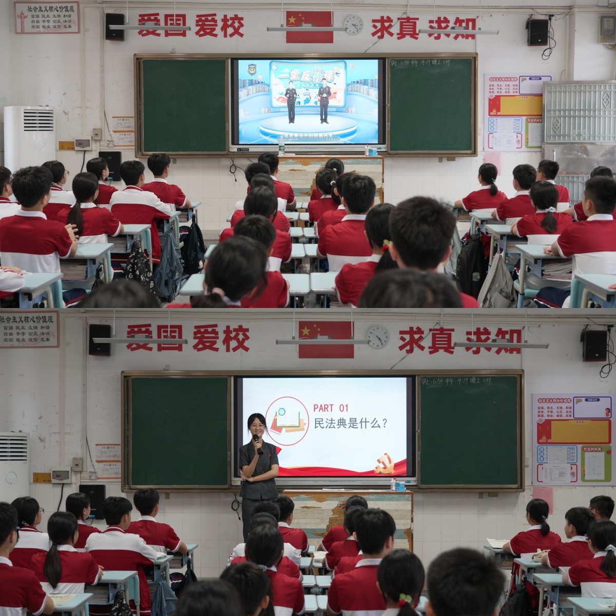 活動中,學生們先觀看了反詐宣傳視頻,聽取了12355心理老師講授的心理講座。隨后,郁南法院干警以“民法典——守護少年的你”為題進行普法宣講,通過“案例講解+互動問答”的形式,將專業知識轉化為通俗易懂的語言,解讀與同學們學習生活密切相關的法律條文,生動剖析校園欺凌、毒品犯罪、“校園貸”等常見風險背后的法律問題,明確告知同學們“行為邊界”與“法律后果”,引導其增強法律意識,樹牢法治觀念。