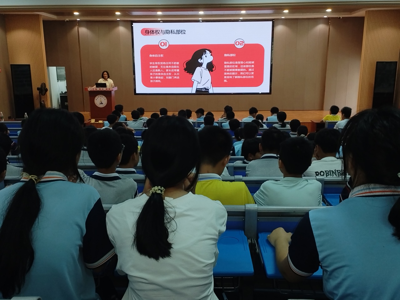 隨后,活動進入安全教育環節。陳主席為同學們帶來“青春護航,安全同行”主題講座。她圍繞防性侵、交通安全、網絡安全及防欺凌等重點內容,通過情景模擬、知識問答等互動方式,生動講解各類安全風險的防范與應對措施,叮囑大家時刻保持警惕,增強自我保護意識和應急處置能力。